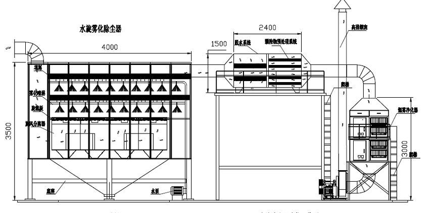 1、當(dāng)生產(chǎn)作業(yè)時(shí),煙塵廢氣在風(fēng)機(jī)牽引力的作用下進(jìn)入旋風(fēng)分離器裝置,煙塵廢氣在離心力的作用下進(jìn)行氣液乳化反應(yīng),在混流液的高速旋轉(zhuǎn)狀態(tài)下,煙塵廢氣與旋轉(zhuǎn)液體充分混合吸收相溶增加煙氣比重,利用離心力達(dá)到氣液分離。